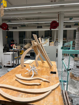 As part of the introductory sculpture class instructed by Professor Roberto Bertoia, students were tasked with a final project of making a painted plywood sculpture exclusively from analog means entirely from scratch. This process started on trace paper with over a hundred iterations drawn progressively to find innovative shapes that breathed originality into the project. The shapes in the sketches were then brought up from two dimensions into three dimensions, as a series of twelve sketch models made out of paper and foam core were ratified with t-pins holding them together in order to examine light, shadow, joinery techniques, and the different viewpoints of the eventual model. After a rigorous process of examining the successful aspects of each sketch model, one final scaled-down model was designed in foam core, placing emphasis on the thickness of the plywood being used, and the seams that would join each shape together to create an aesthetic composition. Once students received approval from the instructor, the final scaled-down model was thoroughly documented, disassembled, traced over a gridded paper, scaled up four times, and then cut out from the scaled-up paper to be traced on a plywood sheet. The plywood sheet was then cut using shop facilities and thoroughly sanded to introduce the joints that would put it together. Once the full-scale model stood, the joints were drilled down; the model was covered in a coat of shellac and covered in multiple layers of paint to create a compelling sculpture with multiple exciting viewpoints.